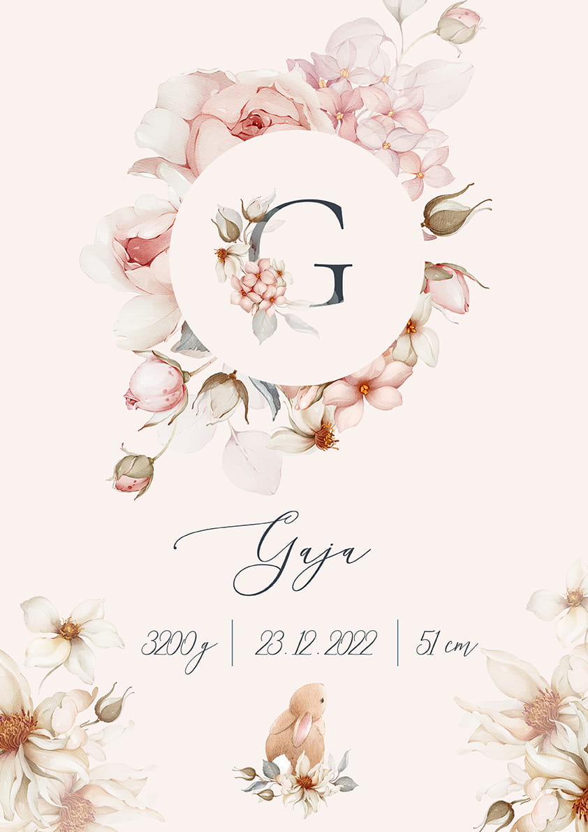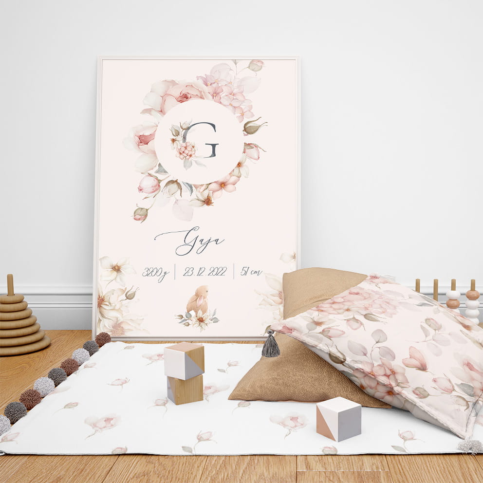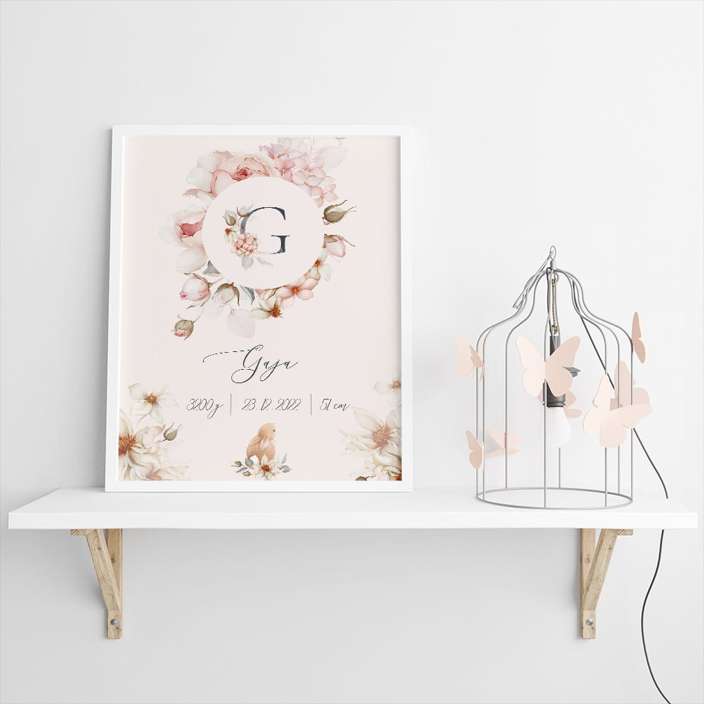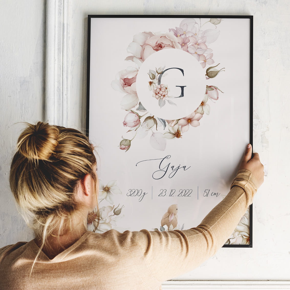 Metryczka to świetny prezent na narodziny dziecka. Ozdobi pokoik i będzie stanowić wyjątkową pamiątkę. Idealnie skomponuje się z innymi produktami z serii "Secret garden" (np. naklejką w kształcie bukietu).