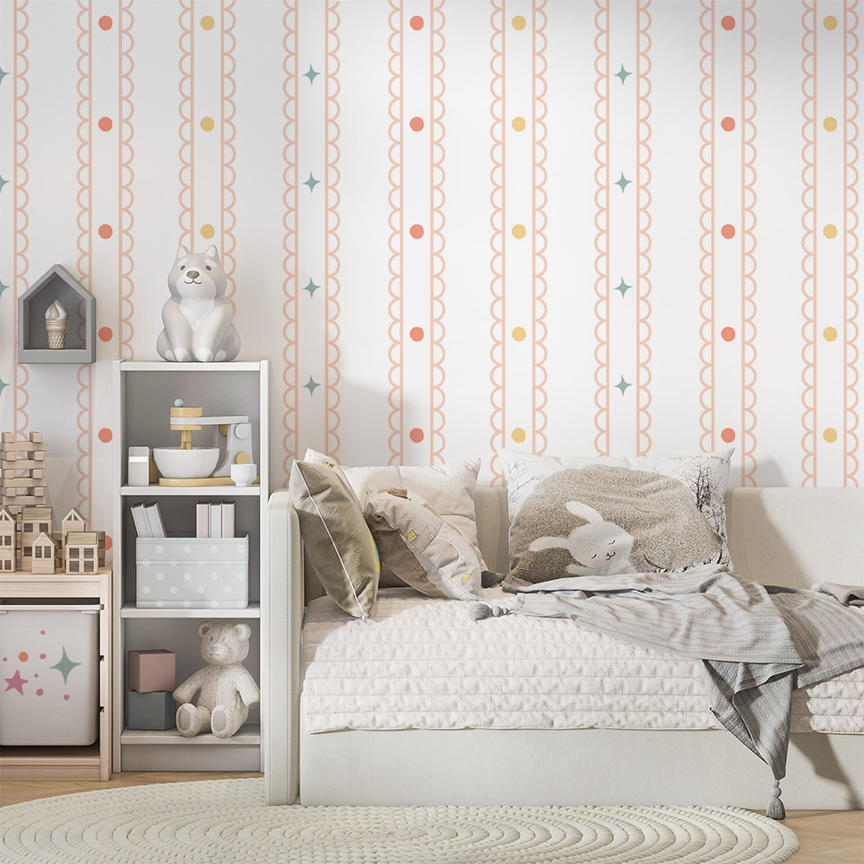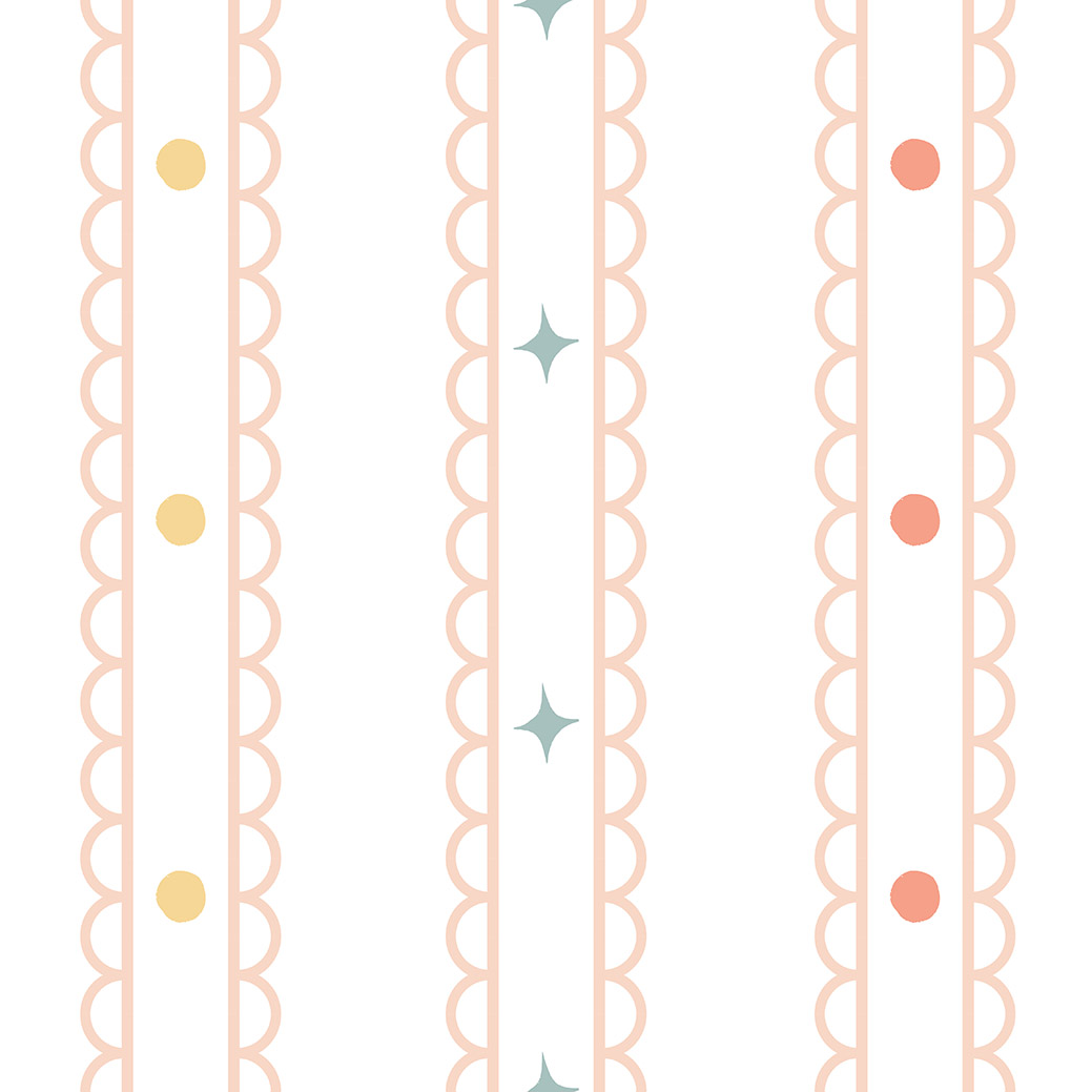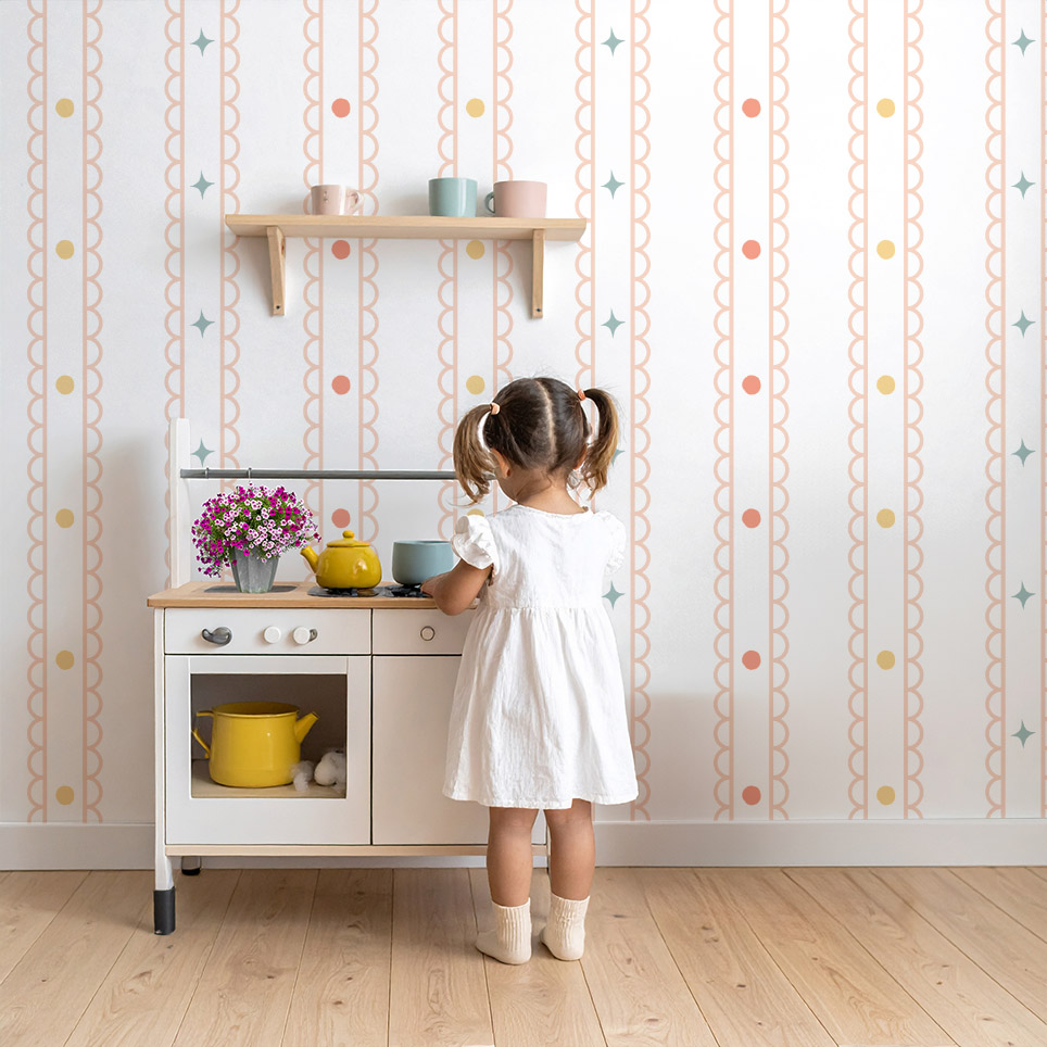 Tapeta do pokoju dziecka, która łączy to co obecnie najmodniejsze - pasy i "falbanki"! Wzór utrzymany jest w pozytywnej, wesołej kolorystyce, która doda charakteru każdemu wnętrzu. Radosne kolory zainspirują do zabawy. To idealny wybór do pokoju dziewczynki.