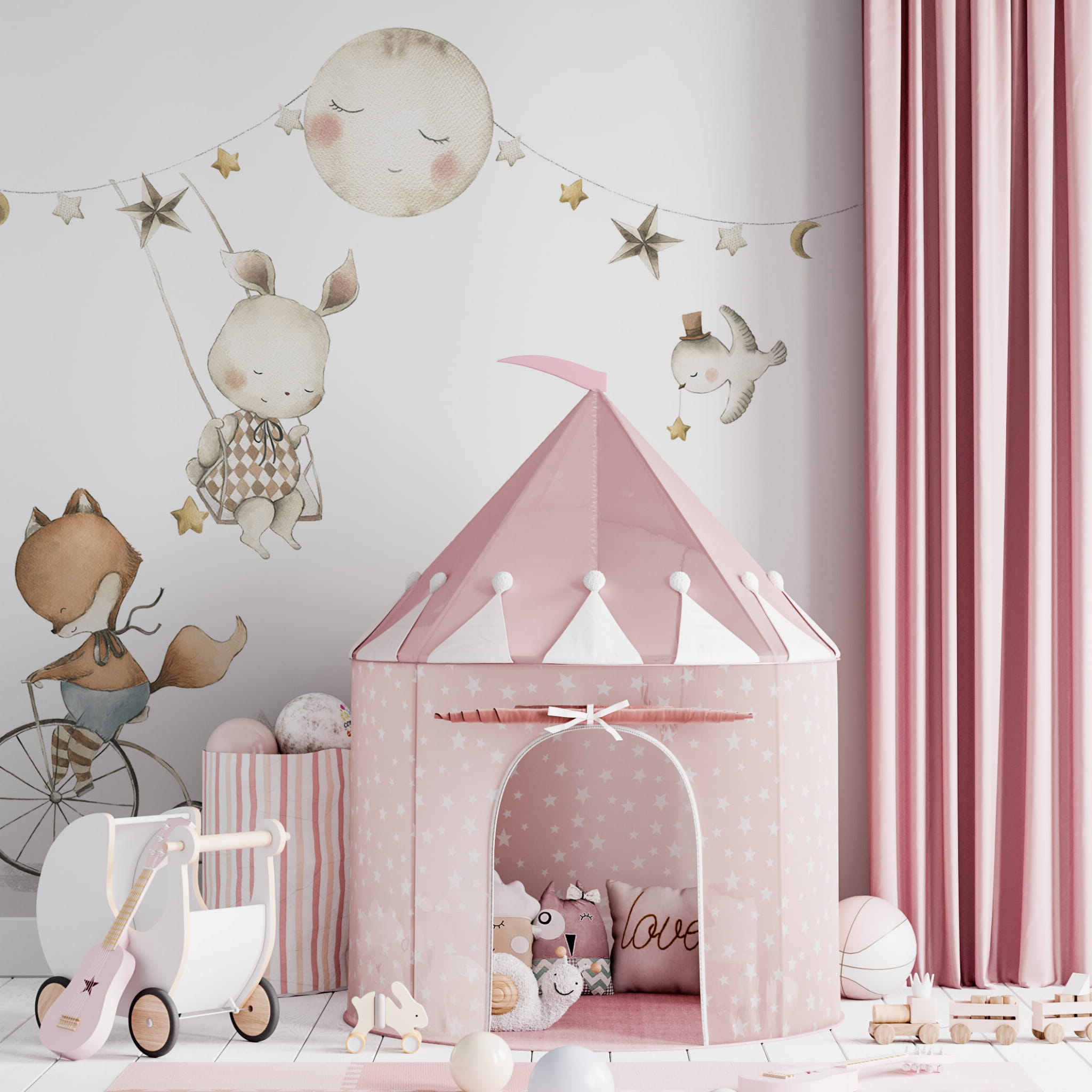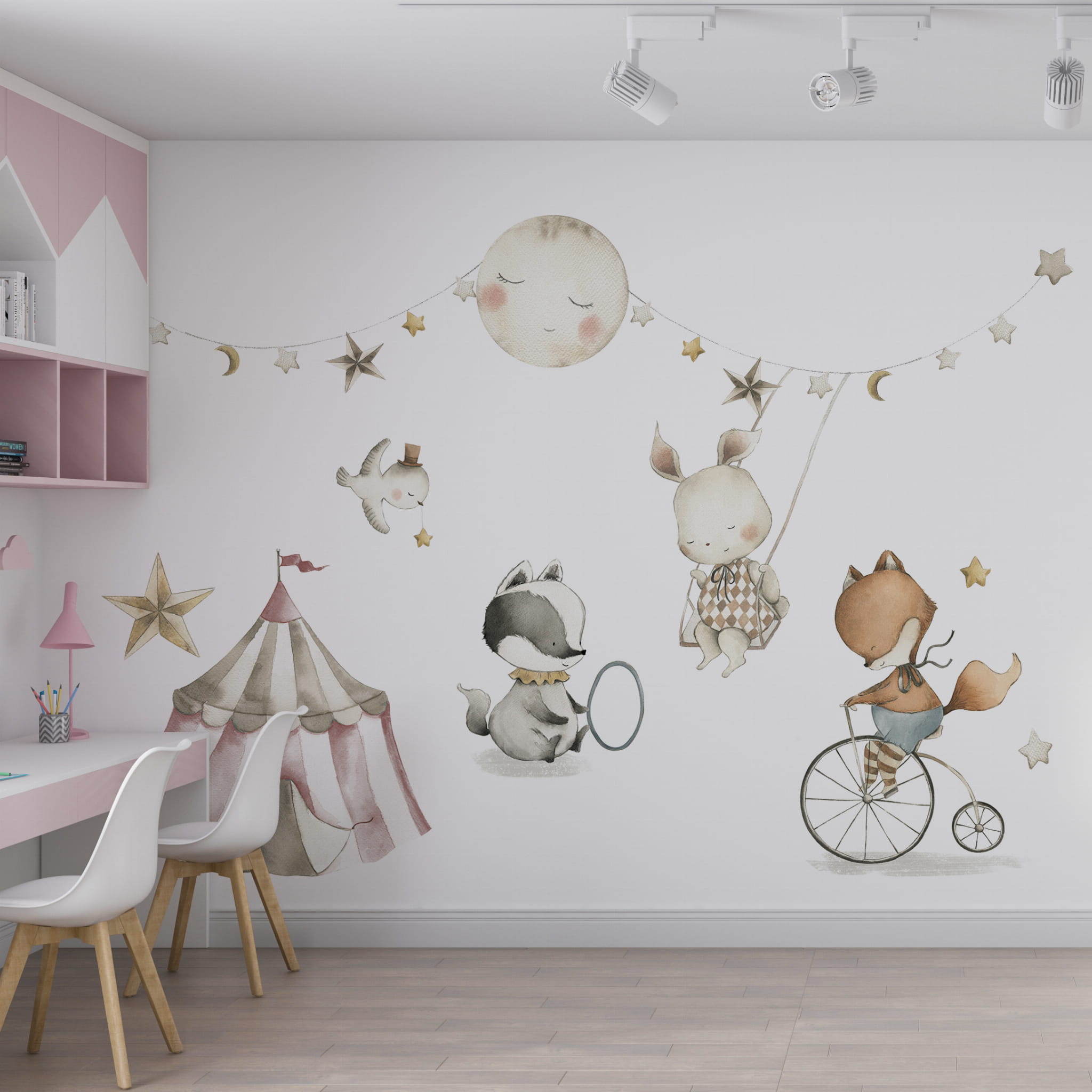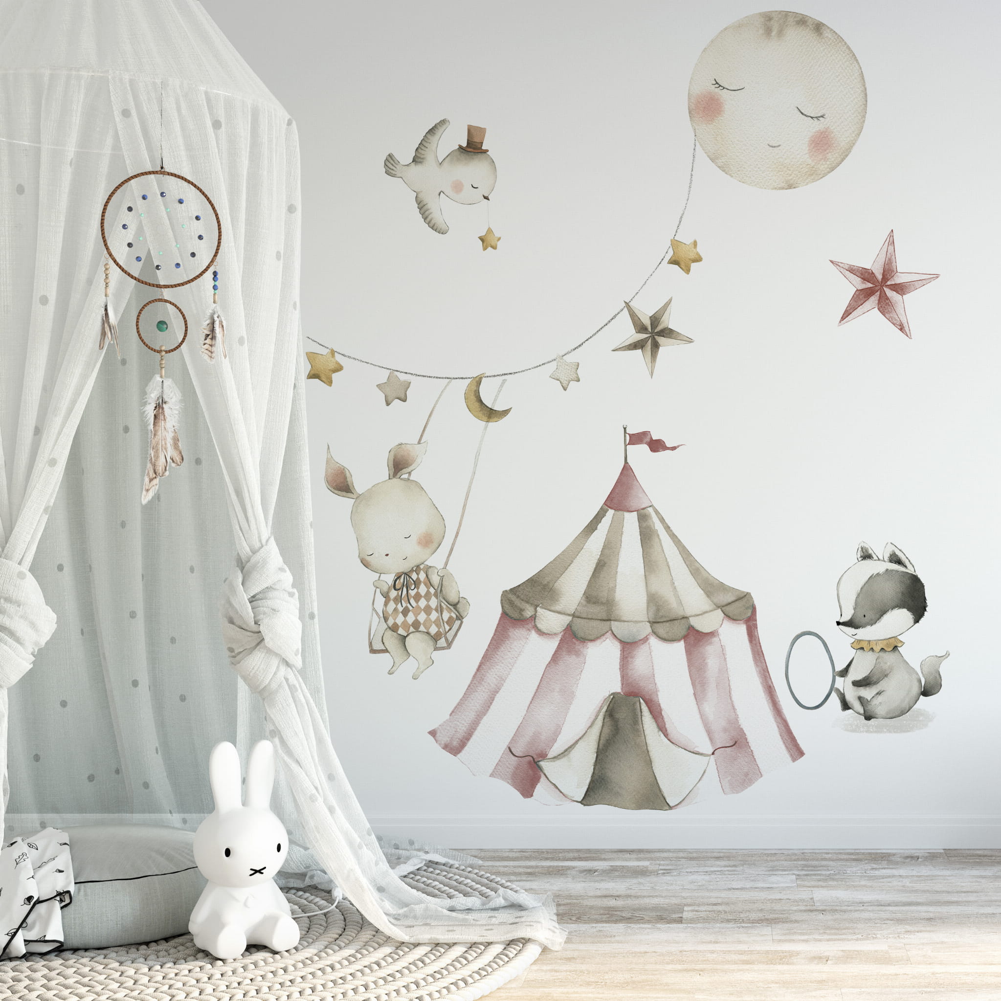 Modne cyrkowe motywy w stonowanych kolorach. Całość zestawu ukazuje ostatnie zdjęcie.