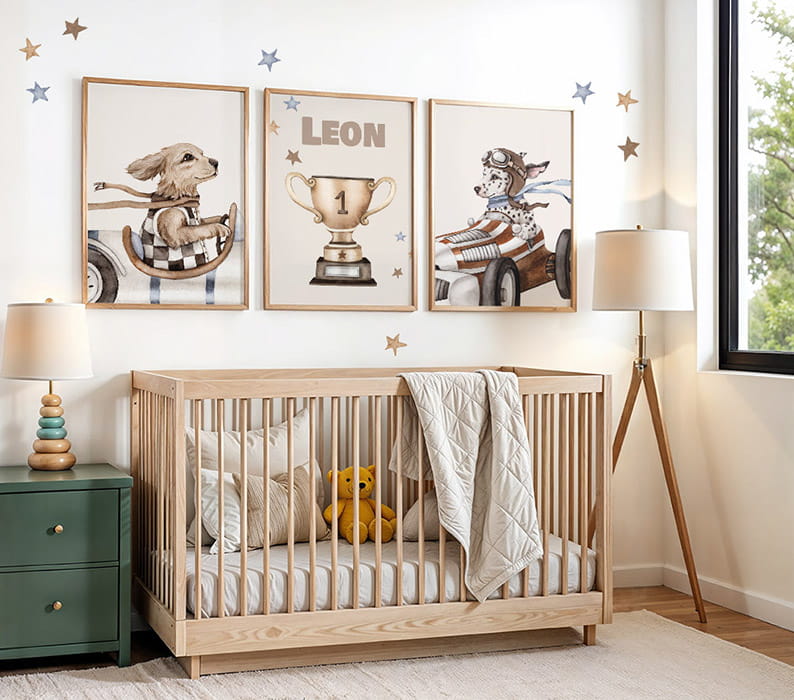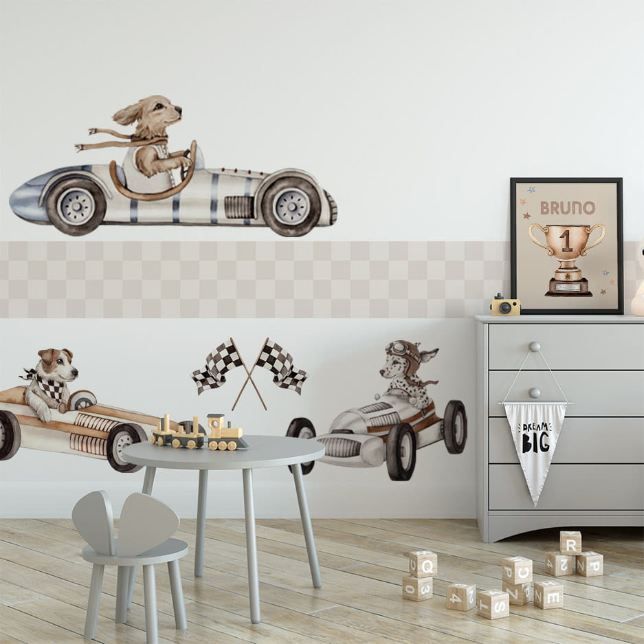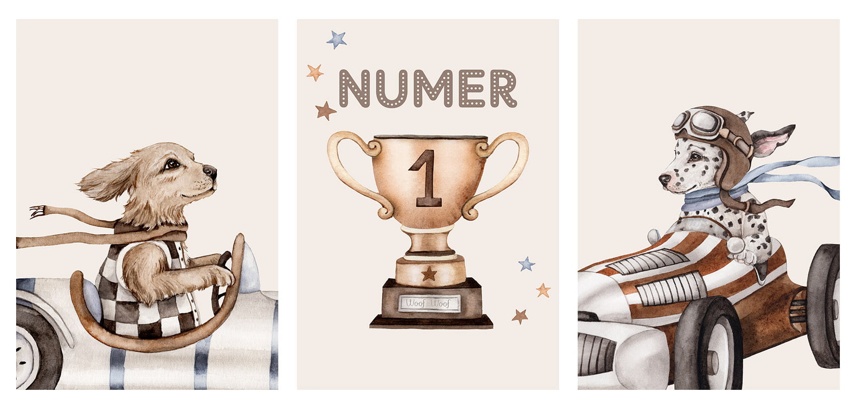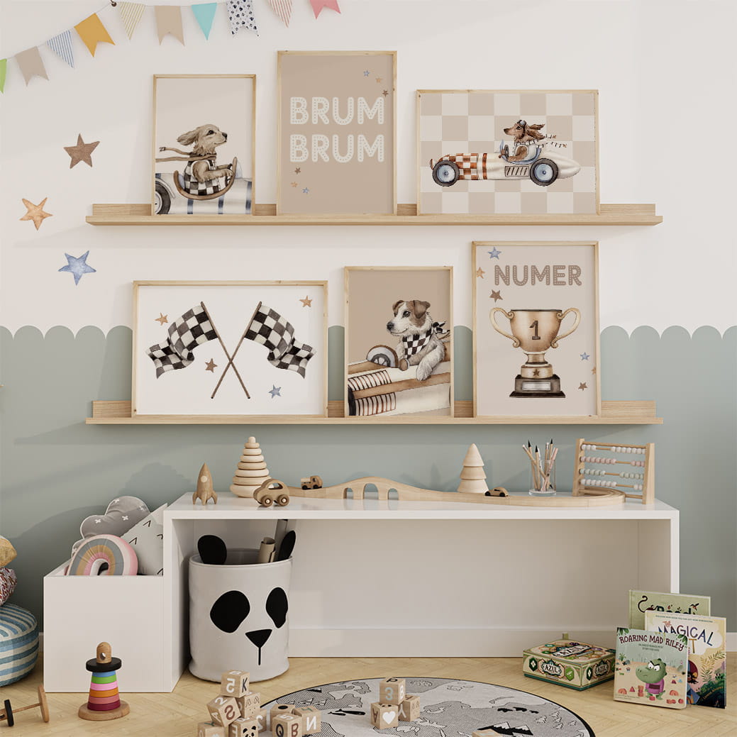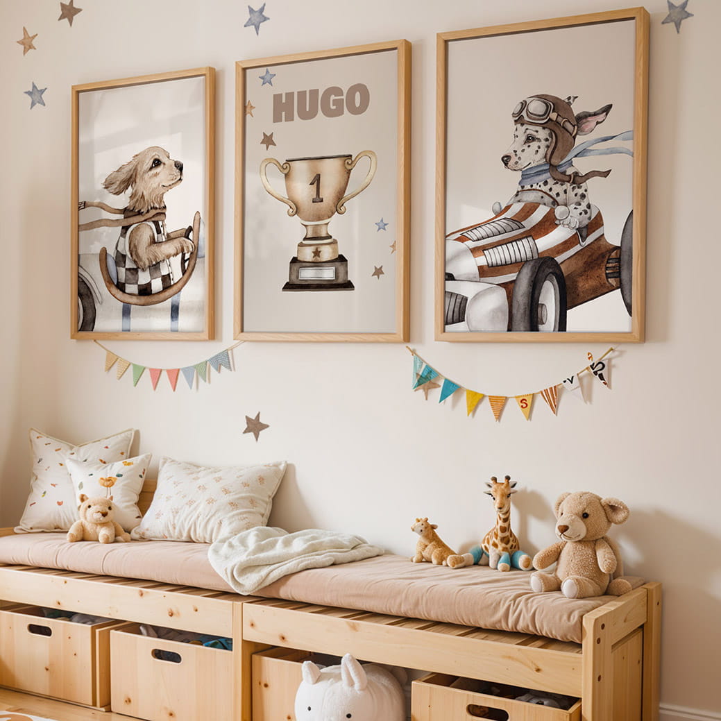 W skład zestawu wchodzą 3 plakaty: golden retriever, puchar, dalmatyńczyk. Istnieje możliwość personalizacji środkowego plakatu – jednak pamiętaj, aby wpisać imię dziecka w uwagach (w innym wypadku na środkowym plakacie będzie słowo "NUMER"). Możesz dobrać też inne plakaty i naklejki z kolekcji z wyścigowymi pieskami, by stworzyć swoją wyjątkową galerię.