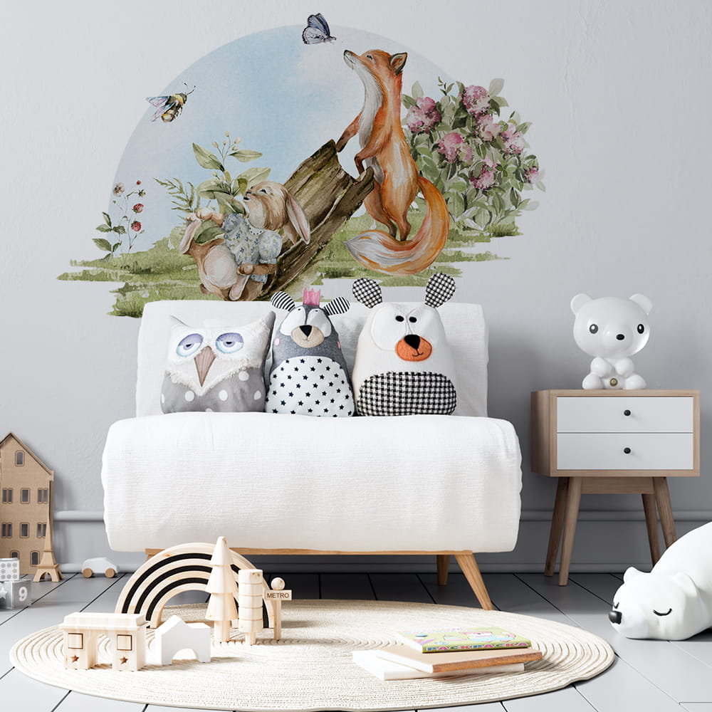 Naklejka "Leśna polana - lis i królik" przyozdobi przestrzeń i jednocześnie zainspiruje do zabawy i poznawania przyrody.
