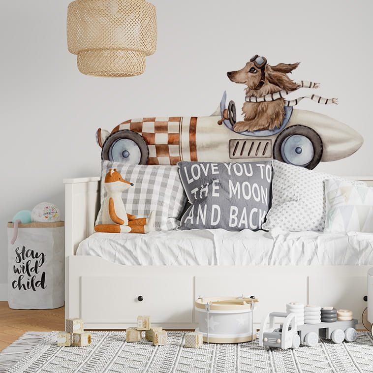 Naklejki ścienne z uroczymi pieskami w rajdówkach to idealna ozdoba do pokoiku każdego fana aut i czworonogów. Zestaw w stonowanych kolorach idealnie pasuje do pozostałych naklejek z motywem piesków i świetnie sprawdzi się jako akcent nad biurkiem, czy komodą. Aplikacja nie wymaga żadnych narzędzi i jest niezwykle prosta. Naklejki z pieskami do pokoju dziecka to bardzo efektowna dekoracja, która pomoże Ci w szybki sposób zrobić metamorfozę wnętrza.