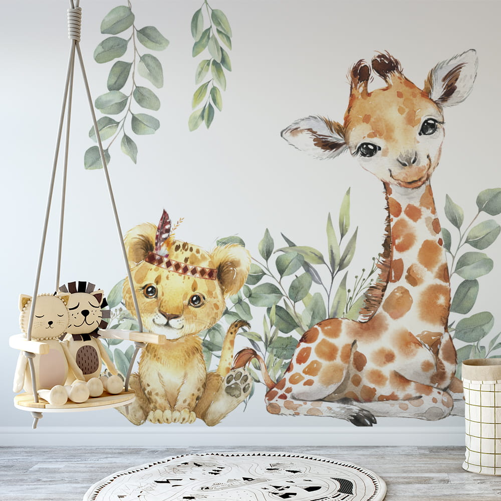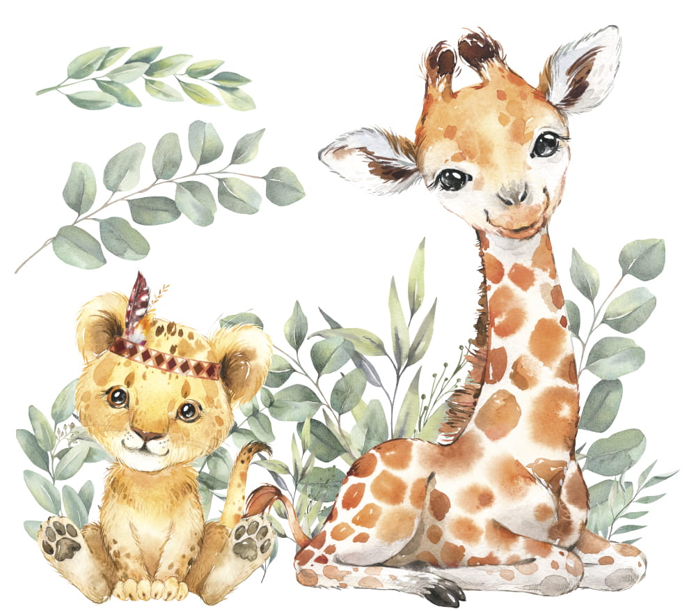 Naklejki wycięte są po obrysie, brak tła. Naklejka ze zwierzętami składa się z dwóch części.