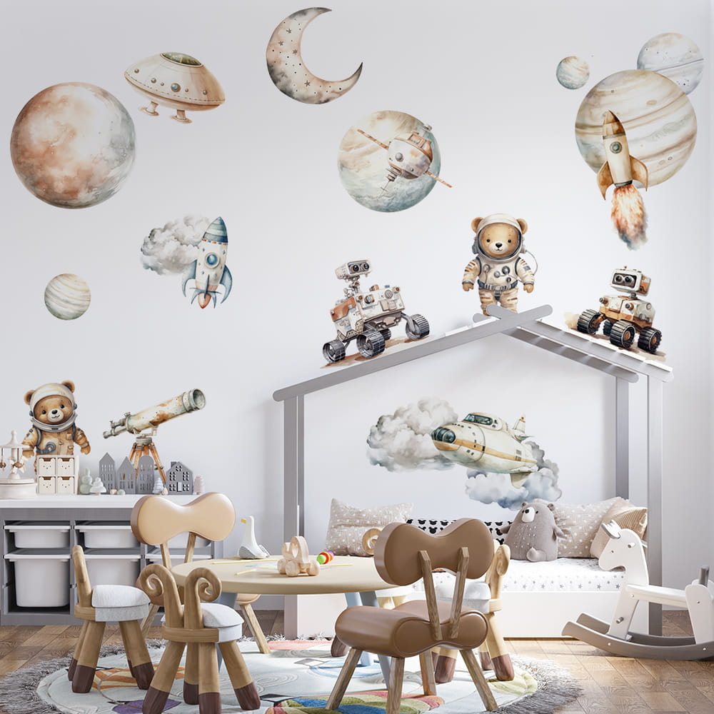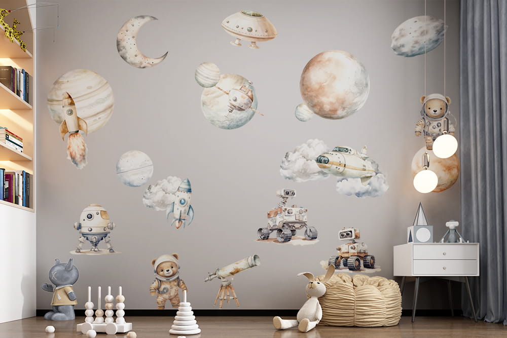 Naklejki wykonane są na białej matowej folii, która idealnie nadaje się do naklejenia na gładkie powierzchnie, jak ściana czy meble. Specjalnie dobrany klej umożliwia jednocześnie trwałe i delikatne przytwierdzenie do powierzchni. Folia jest bezwonna, wodoodporna i posiada certyfikat.