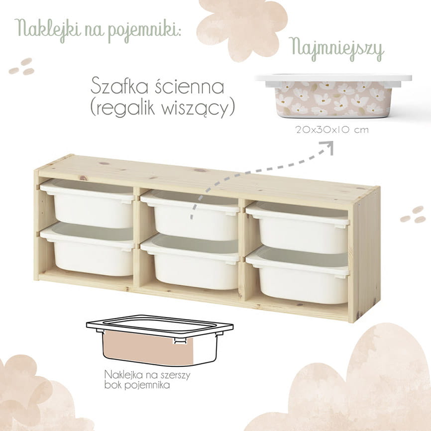 Sprawdź przed zamówieniem, jakie pojemniki posiadasz w swoim regale Trofast i jakiej głębokości jest mebel, aby dobrać odpowiednie naklejki.