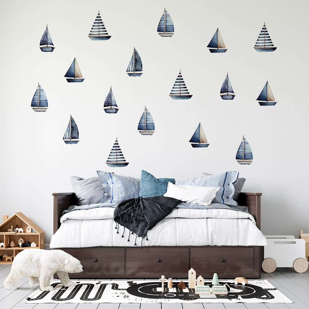 Zestaw niedużych naklejek, które idealnie pasują do pokoików w stylu marynistycznym. Świetnie będą komponowały się z lamperią "Little Sailor".