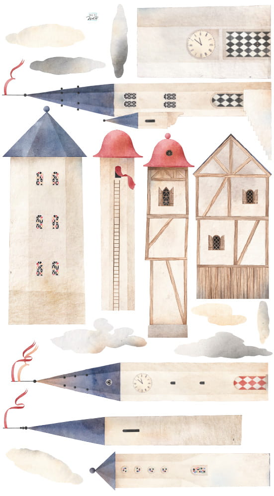 wieże z niebieskim dachem: 31x80cm, 37x98cm, 23x94cm, 21x87cm, 15x66cm