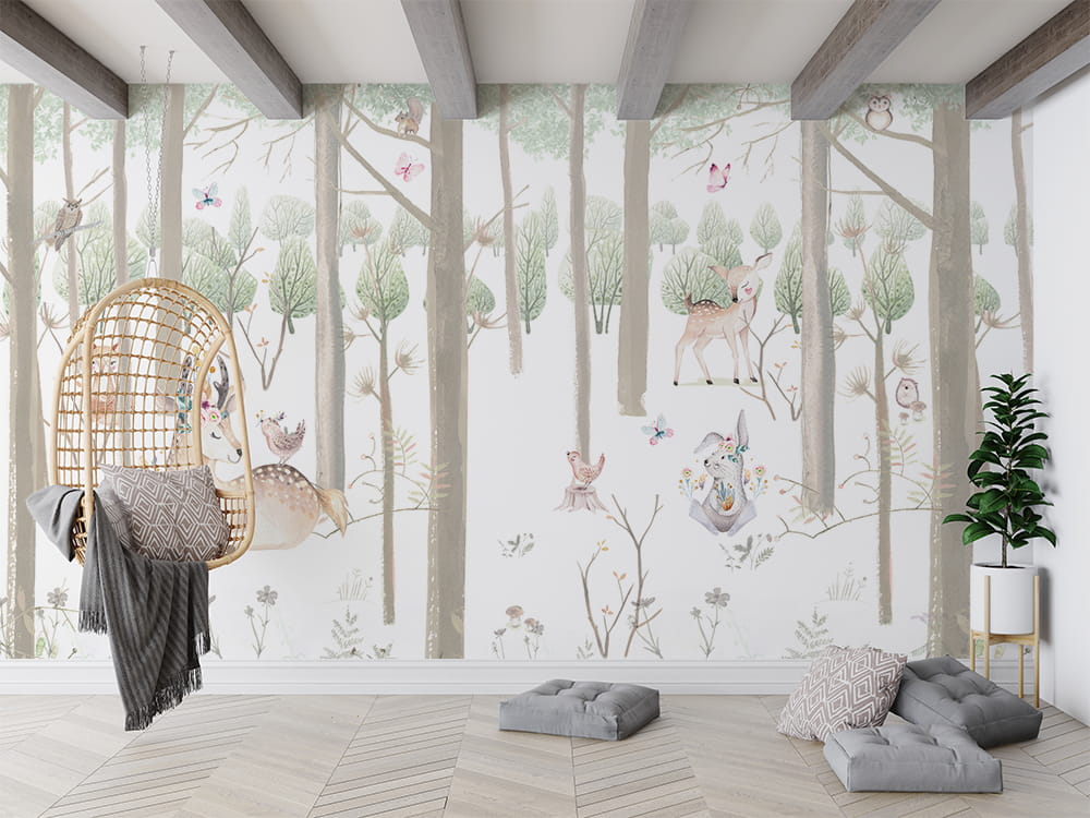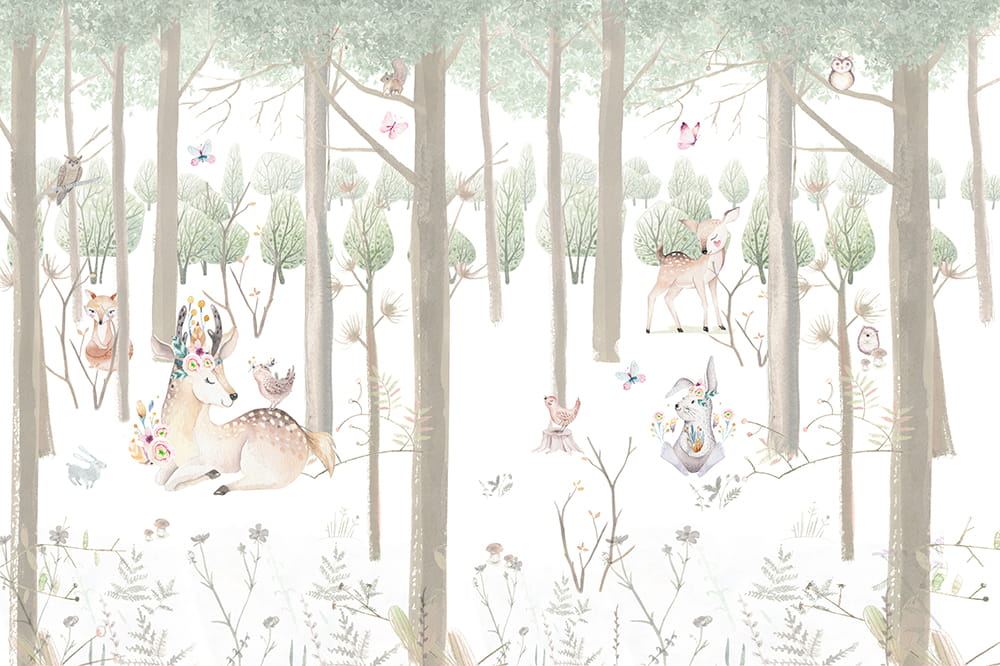 Tapeta "Kwiecista Dolina – liski i króliki – beż"